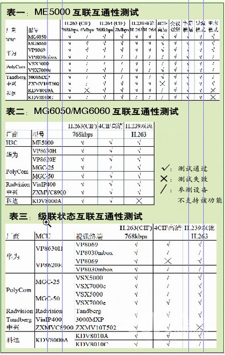眼見為實,為了驗證H3C視訊產(chǎn)品的互聯(lián)互通性,我們對其進(jìn)行了實際測試。互聯(lián)互通性屬應(yīng)用級特性,測試起來并不困難,但有些煩瑣。由于視訊系統(tǒng)核心組件通常包括MCU和視訊終端兩類設(shè)備,兼容性互有交叉,因此我們將測試分成3組進(jìn)行。參與測試的設(shè)備除H3C的MCU(多點控制單元)ME5000和視訊終端MG6050/MG6060外,還包括其它5個廠商的7款MCU和8款視訊終端。