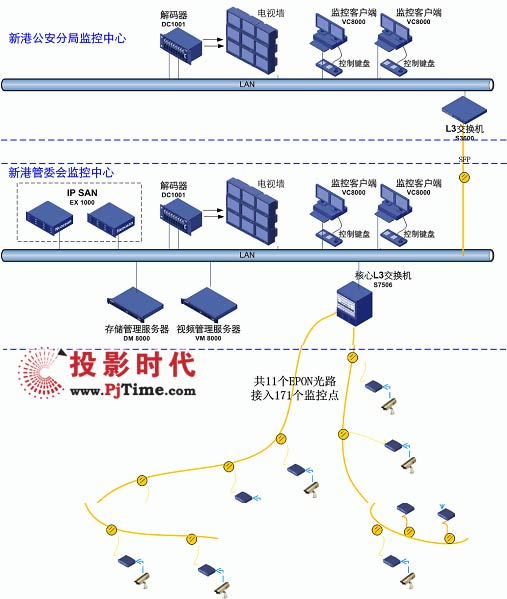 除了攝像頭與圖像顯示設備之外,整個監(jiān)控系統(tǒng)主要采用的都是H3C設備。系統(tǒng)用11(應改成10條,最終只用了10條)條EPON光路接入全部171個監(jiān)控攝像頭;并采用專業(yè)的EX1000存儲產(chǎn)品為120T關(guān)鍵歷史視頻數(shù)據(jù)的提供了高可靠性的存儲保護;而S7506、S3600交換機優(yōu)化的組播特性和特色的雙流技術(shù)則確保了所有監(jiān)控點的高清晰、高實時性、支持大量并發(fā)訪問。系統(tǒng)的集中管理、批量配置、全網(wǎng)網(wǎng)管也可以為新港開發(fā)區(qū)節(jié)省管理成本。