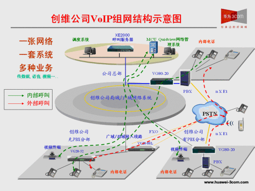 整個(gè)解決方案大量使用了華為3Com公司自主研發(fā)的XE2000、VG80-20、VG20-32、VG20-16、VG21-08等一系列VOIP系統(tǒng),整個(gè)石巖基地語音點(diǎn)數(shù)覆蓋1500點(diǎn)以上,未來發(fā)展可以擴(kuò)展到2500點(diǎn)。