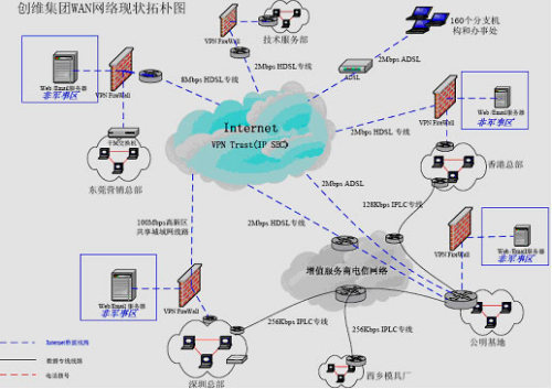 ·整個(gè)網(wǎng)絡(luò)連通性很差:隨著公司業(yè)務(wù)發(fā)展和規(guī)模擴(kuò)大,現(xiàn)在整個(gè)集團(tuán)除總部外還包括13個(gè)產(chǎn)業(yè)公司和全國160個(gè)分支機(jī)構(gòu),分布在以深圳為中心的全國各個(gè)地方,目前各產(chǎn)業(yè)公司之間的網(wǎng)絡(luò)連接除深圳總部、香港、公明基地和西鄉(xiāng)模具廠四地之間是通過窄帶IPLC專線連接外,其他各地均通過Internet公網(wǎng)連接,沒有構(gòu)成統(tǒng)一的企業(yè)內(nèi)部網(wǎng)絡(luò)互連。
