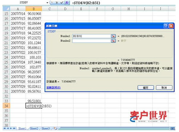 標(biāo)準(zhǔn)差是最小方差管理法高度依賴的指標(biāo),計(jì)算方法很簡(jiǎn)單,在EXCEL里面,只要利用“STDEV”函數(shù),選中你要計(jì)算標(biāo)準(zhǔn)差的數(shù)列,如下圖,我們要計(jì)算7月1號(hào)到30號(hào)平均處理時(shí)長(zhǎng)的標(biāo)準(zhǔn)差,7月1號(hào)到30號(hào)平均處理時(shí)長(zhǎng)的數(shù)據(jù),就是B2到B31這數(shù)列,只要選中這數(shù)列,按“確定”,就會(huì)得出標(biāo)準(zhǔn)差。