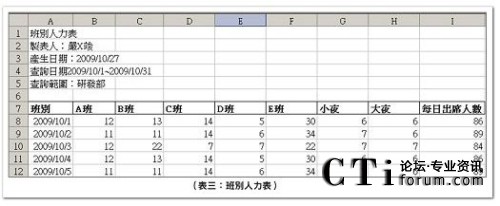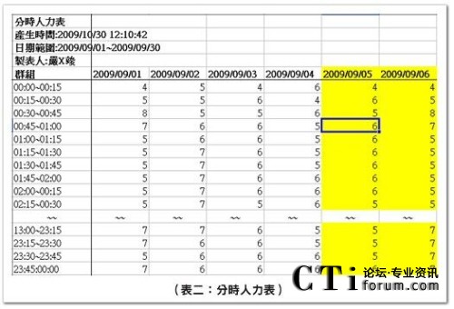 與分時(shí)人力表極為相似,但此報(bào)表顯示的是當(dāng)天每個(gè)班別的表定出席人數(shù),通常是在計(jì)算津貼或是特殊事件(Ex:大夜班座席員數(shù)量)時(shí)使用,唯因現(xiàn)場(chǎng)管理或班務(wù)調(diào)度之需,可能會(huì)拖動(dòng)班表造成座席員表定班別之實(shí)際上下班時(shí)間與原始班別設(shè)計(jì)之起訖時(shí)間不同,管理人員需特別注意。
