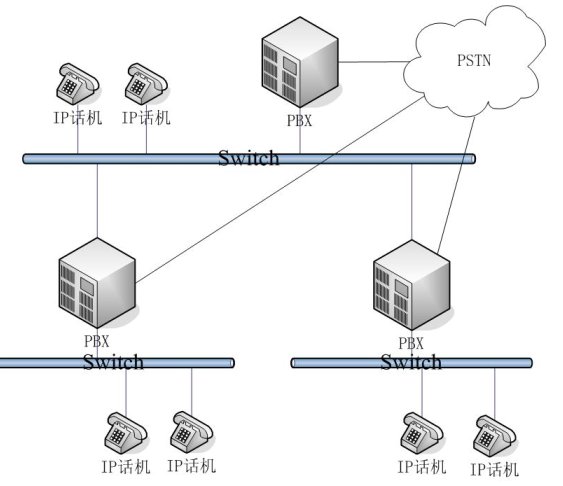 - 普通網(wǎng)絡(luò)結(jié)構(gòu):適用用于中型企業(yè)。在不同地域有公司分部,各分部之間通訊需要通過PSTN,每個(gè)分部都有自己的PBX。相對(duì)于每個(gè)分部而言,采用的是簡(jiǎn)單網(wǎng)絡(luò)結(jié)構(gòu)。