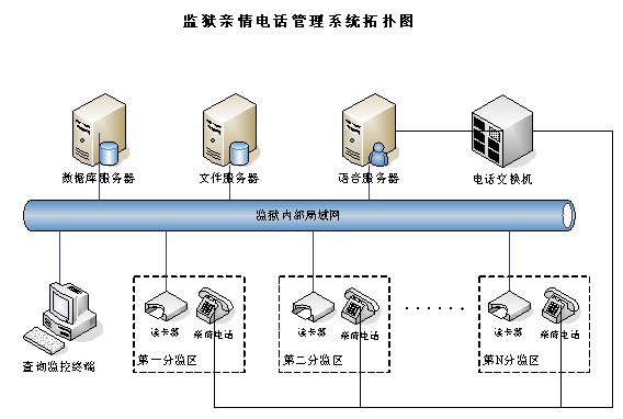 親情電話管理系統(tǒng)在系統(tǒng)設計中充分考慮監(jiān)獄的需求與特點,不但包含了一般親情電話錄音所需的全部功能,而且還融合了獄政管理的功能,整個系統(tǒng)采用集中式方式,在中心機房部署一套親情電話錄音服務器,各個監(jiān)區(qū)監(jiān)控系統(tǒng)利用監(jiān)獄內部的局域網(wǎng)聯(lián)結成一個整體,形成一個能監(jiān)控監(jiān)獄親情電話的全網(wǎng)。這樣即可以在每個監(jiān)區(qū)監(jiān)聽,也可以在監(jiān)獄內部網(wǎng)的任何地方對親情電話進行全程監(jiān)視。該系統(tǒng)能夠完全滿足目前監(jiān)獄的需求,產品性價比遠遠高于市場上其他同類產品。