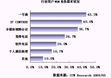 NGN 成為電信運(yùn)營商滿足用戶需求的有力武器。不同的行業(yè)用戶對基于 NGN 推出的電信業(yè)務(wù)表現(xiàn)出了較大的需求差異,例如: IT通信、物流和服務(wù)業(yè)對 IP CENTREX 、多媒體視頻會(huì)議和寬帶電話等業(yè)務(wù)比較感興趣,而政府用戶對一號通等業(yè)務(wù)比較感興趣。不同行業(yè)對業(yè)務(wù)需求具有差異性,這就要求運(yùn)營商基于 NGN 平臺(tái)開發(fā)的業(yè)務(wù)要有更大的靈活性,要有突出用戶通信需求的整體解決方案,要能滿足用戶的個(gè)性化需求。