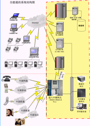 在和創(chuàng)世紀(jì)全能通的基礎(chǔ)下電信、網(wǎng)通、移動(dòng)、聯(lián)通、鐵通、衛(wèi)通等電信運(yùn)營商可用來做下一代網(wǎng)絡(luò)(NGN)業(yè)務(wù)及運(yùn)營,虛擬電信運(yùn)營商和增值業(yè)務(wù)服務(wù)商、新興電信運(yùn)營商開展各種電信運(yùn)營、增值業(yè)務(wù)和搶占語音市場的利器。(具體有關(guān)‘如何用全能通平臺(tái)切入語音市場’,請來來電咨詢)