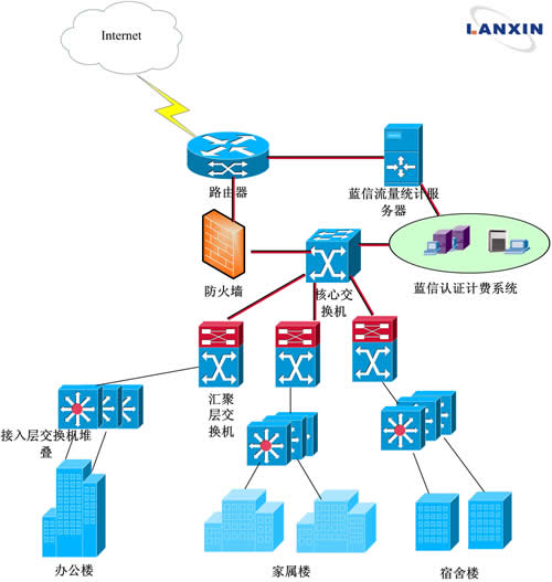 在學校的網絡中心部署藍信認證計費系統(tǒng),負責對用戶的集中統(tǒng)一管理;此外,在網絡的出口處部署藍信流量統(tǒng)計工具,負責對所有流量進行采集,網管者通過客戶端實現(xiàn)對用戶的管理和控制。