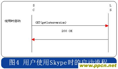 Skype的用戶終端啟動(dòng)時(shí),采用HTTP協(xié)議連接到注冊服務(wù)器,用戶初次安裝的啟動(dòng)流程中攜帶“installed”的參數(shù),使用時(shí)啟動(dòng)流程則在消息中攜帶“getlatestversion”參數(shù),具體流程分別見圖3和圖4。