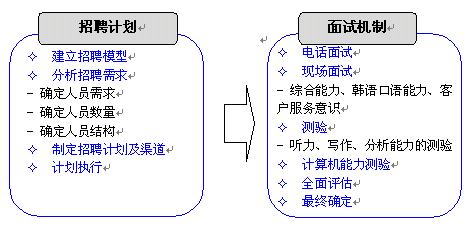 東軟呼叫中心充分挖掘東北地區(qū)豐富的韓語人才資源,通過多種招聘渠道滿足項(xiàng)目的人才需求。東軟自身的教育機(jī)構(gòu)--東軟信息學(xué)院也可以培養(yǎng)專業(yè)的韓語人才,另外,東軟信息學(xué)院與韓國某大學(xué)進(jìn)行戰(zhàn)略合作,通過為韓國留學(xué)生提供呼叫中心實(shí)習(xí)機(jī)會(huì)及漢語培訓(xùn)等,方式,吸引數(shù)名高素質(zhì)韓國大學(xué)生加入呼叫中心,充分滿足該項(xiàng)目對專業(yè)人才的需求。