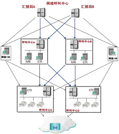 用勤科技的電信級(jí)呼叫中心解決方案,采用前置交換機(jī)和網(wǎng)絡(luò)IVR實(shí)現(xiàn)客戶語音接入排隊(duì),由幾臺(tái)交換機(jī)組成一個(gè)網(wǎng)絡(luò)ACD,呼叫中心A,呼叫中心B和網(wǎng)絡(luò)IVR實(shí)現(xiàn)自動(dòng)語音服務(wù),呼叫中心C和呼叫中心D實(shí)現(xiàn)人工服務(wù)。呼叫中心C和呼叫中心D實(shí)現(xiàn)負(fù)載均衡,互為備份,如果其中一個(gè)呼叫中心癱瘓,另外一個(gè)呼叫中心自動(dòng)接管完全的呼叫。