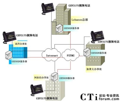 在Tabbara公司的全球四個(gè)辦事處分別安裝潮流網(wǎng)絡(luò)的GXE5028 IPPBX服務(wù)器或者其他的SIP Sever通信平臺(tái),GXE5028 IP PBX支持語(yǔ)音信箱,郵件和其他通信功能應(yīng)用,每一臺(tái)GXE5028最大限度地支持分布全球辦事處的所有通信賬號(hào)同時(shí)連接到同一網(wǎng)絡(luò)中,終端連接IP電話,IP視頻電話以及IP視頻監(jiān)控?cái)z像機(jī)作為語(yǔ)音/數(shù)據(jù)的輸入輸出,當(dāng)然IP PBX也可通過(guò)網(wǎng)絡(luò)連接到VoIP服務(wù)器中間位置的SIP中繼。潮流網(wǎng)絡(luò)的GXV3175多媒體觸摸屏視頻電話,支持標(biāo)準(zhǔn)的SIP協(xié)議,先進(jìn)的H.264/H.263/H.263+視頻壓縮標(biāo)準(zhǔn),寬大的7寸彩色觸摸顯示屏實(shí)現(xiàn)溝通面對(duì)面的零距離交流,以及撥打網(wǎng)絡(luò)攝像機(jī)觀看監(jiān)控現(xiàn)場(chǎng)。潮流網(wǎng)絡(luò)的GXV3662_HD高清防暴半球IP攝像機(jī)和GXV3651_HD IP攝像機(jī),分別安裝在辦事處關(guān)鍵位置,365天,每周24*7個(gè)小時(shí)進(jìn)行實(shí)時(shí)監(jiān)控,作為企業(yè)財(cái)產(chǎn)和人員安全的保障。方案中,各分支機(jī)構(gòu)之間通話免費(fèi),撥打分支機(jī)構(gòu)所在地其他電話按市話費(fèi)算,出差人員使用IP電話與公司內(nèi)部通話免費(fèi)。