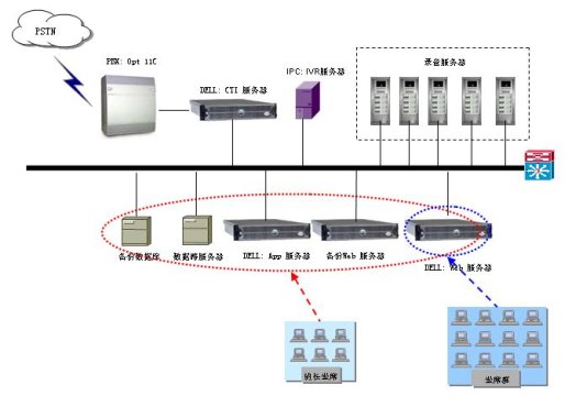PBX、PowerCALL中間件、PowerVOICE、CRM系統(tǒng)、Web網(wǎng)站、人工座席、報(bào)表、錄音、監(jiān)控等。