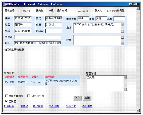 客戶向麥考林定購商品的最常用途徑就是電話訂貨,客戶撥打麥考林服務(wù)熱線進(jìn)入客服系統(tǒng)。系統(tǒng)會(huì)根據(jù)客戶的主叫號(hào)碼對(duì)客戶進(jìn)行識(shí)別,如果識(shí)別成功,座席代表屏幕上會(huì)自動(dòng)彈出客戶資料和以往訂貨記錄;如果識(shí)別失敗,座席代表可以根據(jù)客戶通報(bào)的客戶代碼或姓名等信息查詢客戶資料。如果是新客戶,座席代表可以立即為他創(chuàng)建客戶檔案。