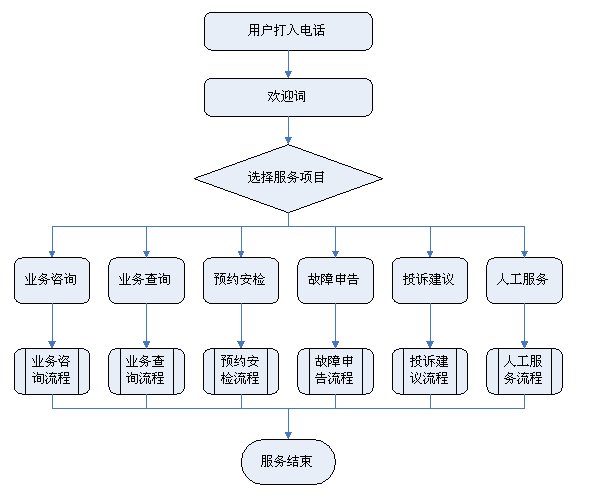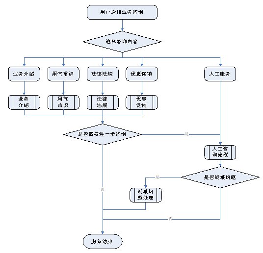1)業(yè)務(wù)咨詢:用戶通過人工、自動語音等方式咨詢有關(guān)政策法規(guī)、資費標準、用氣常識、報裝方法等,系統(tǒng)以語音、傳真、Email、短消息等方式回復客戶。