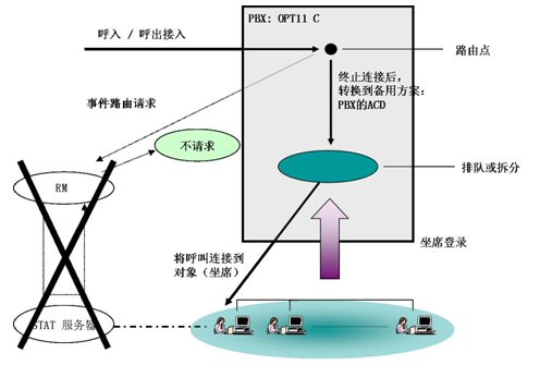 如果CTI服務出現(xiàn)不可恢復的故障,CTI控制會將控制權交還給PBX,此時,PBX的ACD將自動生效,進行呼叫的分配可確保電話能夠有坐席接聽。