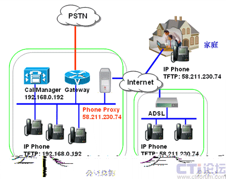 PCS的PhoneProxy是一套軟件,只要在中心CallManager站點安裝一套PhoneProxy,就能實現(xiàn)任何能上網(wǎng)的地方,IP電話都能通過廣域網(wǎng)注冊,不需要任何VPN設(shè)備。