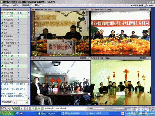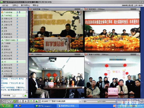 春節(jié)是中華民族的傳統(tǒng)的節(jié)日,尤其是跨國企業(yè)集團,身在海外的游子們,這一刻多么期待與在國內(nèi)的親人、朋友、以及同事網(wǎng)絡(luò)“面對面”的過春節(jié);因此,一些企業(yè)用視維視頻會議舉辦了別開生面的視頻拜年會。其中京信通信公司視頻年會尤為精彩,廣州科學(xué)城的主會場、廣州開發(fā)區(qū)、香港、北京、上海、西北分公司、武漢等20多個分公司通過視維視頻會議互拜大年,通過網(wǎng)絡(luò)視頻,遠隔千里一樣可以“面對面”的送上新春祝福。如下圖: