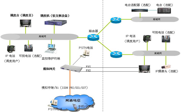 IP指揮調(diào)度語音通信系統(tǒng)由調(diào)度機(jī)、調(diào)度臺、媒體網(wǎng)關(guān)、IP電話、電臺適配器、電臺等設(shè)備組成,整體系統(tǒng)采用軟交換網(wǎng)絡(luò)的結(jié)構(gòu),構(gòu)建于以太網(wǎng)之上。傳輸網(wǎng)絡(luò)由通過路由器連接的多個局域網(wǎng)構(gòu)成;