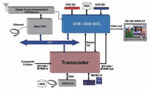 轉(zhuǎn)碼硬件必須與整個STB系統(tǒng)中的其他系統(tǒng)進行良好交互,其中包括數(shù)字調(diào)諧器、解多路復用器 (Demuxer)和解調(diào)器、DDR2存儲器、PCI總線,以及向STB SoC傳輸音/視頻的高帶寬接口。圖2是常見的架構示意圖。