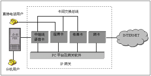 電話語(yǔ)音卡在IP網(wǎng)關(guān)中的典型應(yīng)用結(jié)構(gòu)如下: