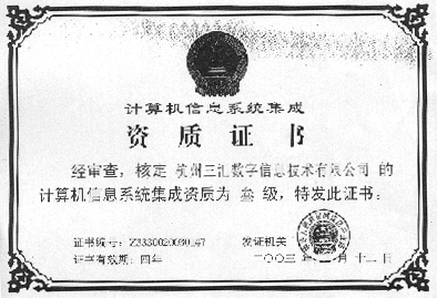 按照《計算機信息系統(tǒng)集成資質管理辦法(試行)》和《計算機信息系統(tǒng)集成資質等級評定條件(試行)》,經信息產業(yè)部計算機信息系統(tǒng)集成資質認證管理委員會審定,在不久前,信息產業(yè)部公布的計算機信息系統(tǒng)集成資質證書企業(yè)名單中,杭州三匯數(shù)字信息技術有限公司獲得叁級認證。