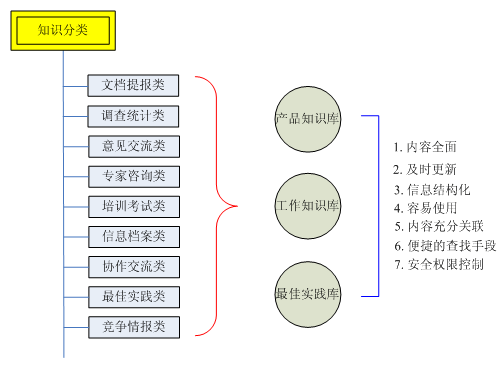 具體包括:為FAQ咨詢服務(wù)提供強力支持的產(chǎn)品知識庫;員工可以快速獲得工作知識,并能把自己的知識共享給別人的工作知識庫;支持各項事務(wù)最佳方案和方法操作處理的最佳實踐庫;以及支持知識庫實際運行的知識地圖和搜索引擎。