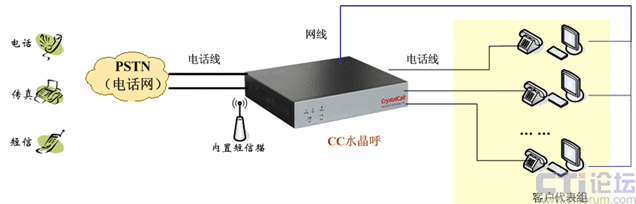 CC水晶呼單獨組網,對外接運營商的電話線,對內接分機線,組網說明如下:
