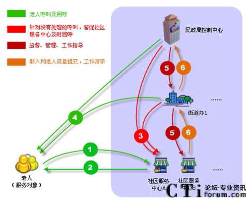 社區(qū)呼叫平臺(tái)包含:老人、民政局、街道辦、社區(qū)服務(wù)中心四個(gè)業(yè)務(wù)角色,民政局、街道辦、社區(qū)服務(wù)中心通過(guò)專(zhuān)用網(wǎng)絡(luò)建立高效聯(lián)動(dòng)機(jī)制。