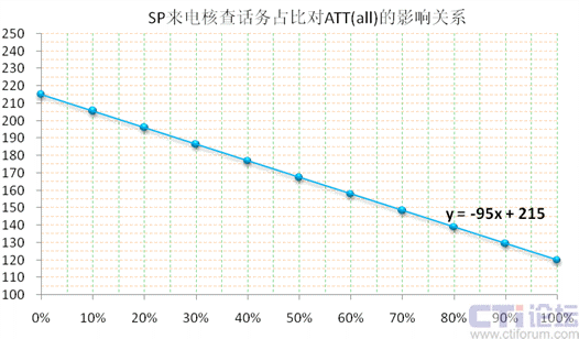 我們把話務構成簡單化,假設只有“來電核查”和“Inbound”兩大隊列,在上下6%的波動范圍內,取ATT(sp)=120秒,ATT(in)=215秒,“SP來電核查”話務占比=x,則“Inbound”話務占比=1-x,ATT(all)=y(tǒng),整體通話均長y與“SP來電核查”話務占比x存在如下線性關系:(下圖13)