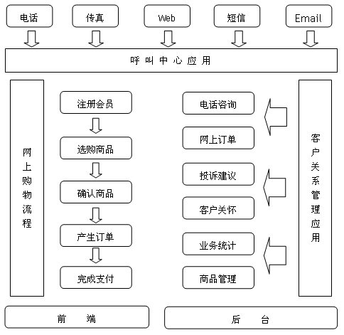 依照我公司的建設(shè)方向,中小型網(wǎng)上購(gòu)物平臺(tái)的客戶服務(wù)呼叫中心系統(tǒng)應(yīng)具備呼叫中心的基本功能,同時(shí)融入了網(wǎng)上購(gòu)物的客戶關(guān)系管理(CRM)流程,因此,它是呼叫中心與CRM系統(tǒng)的有機(jī)結(jié)合體,包含電話咨詢、網(wǎng)上訂單、客戶關(guān)懷等主要功能層的應(yīng)用。