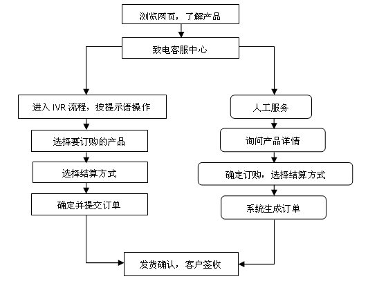 顧客的電話訂購(gòu)主要有兩種方式:一種方式為在購(gòu)物平臺(tái)400或800電話的IVR流程中根據(jù)提示語(yǔ)音來(lái)完成訂購(gòu)過(guò)程;另一種方式為人工服務(wù),客服人員幫助顧客完成訂購(gòu)過(guò)程。