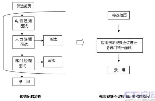 從上圖不難看出,通過應(yīng)用視高(Seegle)視頻會(huì)議系統(tǒng)進(jìn)行招聘,能大大縮短流程和周期,免除了求職者一次次的來回奔波,方便異地進(jìn)行面試。企業(yè)不僅可以在當(dāng)?shù)卣衅,更可以將招聘延伸到全國,甚至世界?br />