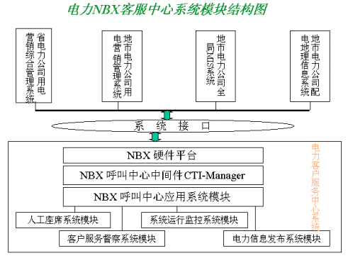 該方案以美國3COM公司的NBX產(chǎn)品為系統(tǒng)平臺,結(jié)合其配套的中間件產(chǎn)品CTI-Manager和上層第三方專業(yè)的電力行業(yè)應用系統(tǒng),為各省、市電業(yè)公司建立起新型的電力呼叫中心(Call Center)。使電力客服中心系統(tǒng)以呼叫中心為基礎,以電力系統(tǒng)其他后方資源信息(CIS,DMS,負控等系統(tǒng))為依托,為客戶提供電話、傳真、郵件、Internet等多種接入方式,通過和電力其他業(yè)務系統(tǒng)有機的結(jié)合,滿足客戶不同層次、個性化與多樣化的業(yè)務需求,提供了包括錄音、會議電話、統(tǒng)一消息和智能路由在內(nèi)的多種功能。