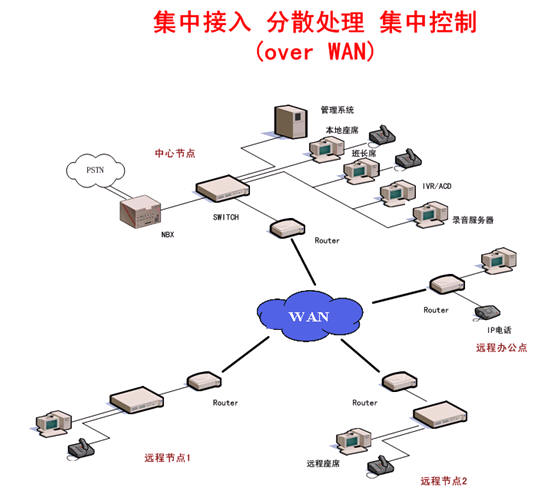 VoIP 技術(shù)與呼叫中心的結(jié)合,不僅僅讓用戶享受到Internet帶來的大量話費的節(jié)約,更使基于Internet連接的分布式呼叫中心成為可能。分布式的呼叫中心系統(tǒng),集中式的管理,才能真正滿足那些擁有多個分支機(jī)構(gòu)的行業(yè)和企業(yè)用戶建設(shè)呼叫中心的需求;贗P分布式的NBX呼叫中心平臺支持遠(yuǎn)端坐席,利用現(xiàn)有的企業(yè)專線實現(xiàn)分布呼叫,同時簡化管理,由于人工坐席技能差異、語言差異、呼叫量的差異,以及客戶中心客戶所在地的變化及每個客戶對各自所擁有的用戶資料的保密性需求,分布式呼叫中心往往更適合各類企業(yè)的實際。分布式呼叫中心的建立,意味著需要在多個分中心之間進(jìn)行統(tǒng)一的呼叫控制及語音與同步數(shù)據(jù)轉(zhuǎn)移。NBX作為IP-PBX的引入,兩網(wǎng)合一的特性使分布式呼叫中心的建立成為了一件非常容易的事情。呼叫中心可以擴(kuò)展到多個位于不同地域的局域網(wǎng)上,通過路由選擇可以自動地把呼叫(語音)和數(shù)據(jù)從一個地點轉(zhuǎn)到另一個地點中心,因為語音數(shù)據(jù)通過同一網(wǎng)絡(luò),語音和數(shù)據(jù)同步轉(zhuǎn)移是很自然的。由于數(shù)據(jù)和語音全部通過以太網(wǎng)傳輸,所以不用支付昂貴的長途話費,降低了企業(yè)及客戶的開銷,同時由于各分支機(jī)構(gòu)可將各自的客戶資料保存在各分中心,這樣不僅大大降低了呼叫中心對數(shù)據(jù)庫的維護(hù)管理工作,也節(jié)約了設(shè)備投入及運營維護(hù)成本。