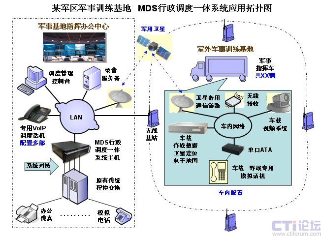 為了加強(qiáng)現(xiàn)代化軍隊(duì)的建設(shè),某軍區(qū)在其軍分區(qū)的指揮訓(xùn)練基地,使用先進(jìn)的技術(shù),搭建了一套由幾十輛軍事指揮車組成的作戰(zhàn)指揮訓(xùn)練系統(tǒng),其中的語(yǔ)音通信指揮系統(tǒng)部分,采用了美國(guó)Zed-3公司最先進(jìn)的基于IP技術(shù)的MDS80行政調(diào)度一體化通信系統(tǒng),解決了訓(xùn)練基地的指揮中心大樓的原有通信系統(tǒng),與室外的訓(xùn)練基地各輛指揮車之間,通過基地?zé)o線網(wǎng)絡(luò)及衛(wèi)星備份鏈路提供的IP通道,實(shí)現(xiàn)語(yǔ)音的指揮調(diào)度通信,達(dá)到訓(xùn)練基地要求的最佳的語(yǔ)音指揮調(diào)度通信效果。