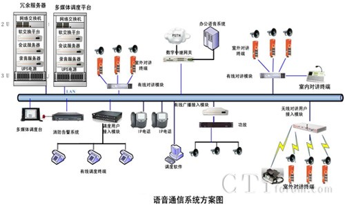 整體解決方案由軟交換服務(wù)器、會(huì)議服務(wù)器、錄音服務(wù)器、數(shù)字中繼網(wǎng)關(guān)、調(diào)度臺(tái)、有線對(duì)講模塊、有線廣播模塊、無線對(duì)講模塊等幾部分組成,系統(tǒng)基于IP網(wǎng)絡(luò)部署,所有設(shè)備均直接接入到IP網(wǎng)絡(luò)上,通過IP網(wǎng)絡(luò)匯聚到指揮中心進(jìn)行交換和統(tǒng)一管理調(diào)度。