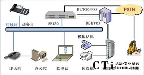 中小型企業(yè)語音通信系統(tǒng)集IP-PBX、語音網(wǎng)關(guān)、互聯(lián)網(wǎng)網(wǎng)關(guān)等多種功能于一身,可以兼容傳統(tǒng)PBX的全部功能,同時(shí)也可作為VoIP網(wǎng)關(guān)使用,把基于IP的SIP通訊轉(zhuǎn)換成PSTN通訊。通過采用開放的標(biāo)準(zhǔn)協(xié)議,系統(tǒng)(SE150)可以兼容眾多國(guó)際、國(guó)內(nèi)IP電話、語音網(wǎng)關(guān)廠家的產(chǎn)品。