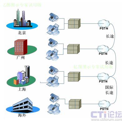 各分支機(jī)構(gòu)租用獨(dú)立的電話號碼并接入當(dāng)?shù)豍STN,在這種架構(gòu)下,各地之間通話就會產(chǎn)生長途費(fèi)用,并占用電話線路,但如果使用IP
