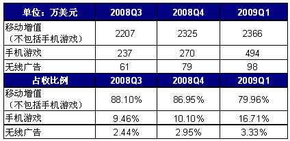 2009年第1季度,空中網(wǎng)手機(jī)游戲服務(wù)營(yíng)收為494萬(wàn)美元,同比增長(zhǎng)304%,環(huán)比增長(zhǎng)83%;其中手機(jī)網(wǎng)游的營(yíng)收為72萬(wàn)美元,同比增長(zhǎng)379%,環(huán)比增長(zhǎng)11%,單機(jī)游戲和WAP頁(yè)面游戲的服務(wù)營(yíng)收為422萬(wàn)美元,同比增長(zhǎng)293%,環(huán)比增長(zhǎng)106%。手機(jī)游戲業(yè)務(wù)在空中網(wǎng)銷(xiāo)售收入中所占比重由2008年第4季度的10.10%上漲至16.71%。