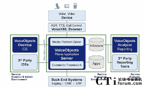 VoiceObjects體系結(jié)構(gòu)支持輕松地開發(fā)、部署和維護(hù)帶有語音、視頻、文本和移動(dòng)互聯(lián)網(wǎng)接口的電話應(yīng)用。通過緊密集成提供實(shí)時(shí)分析的VoiceObjects分析器和提供應(yīng)用創(chuàng)建與維護(hù)的VoiceObjects桌面,VoiceObjects服務(wù)器成為提供動(dòng)態(tài)對(duì)話和接口生成的執(zhí)行引擎。