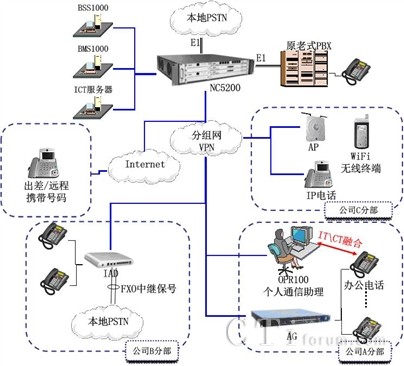 震有科技NC5200系列IP-PBX可作為核心軟交換設(shè)備放置在公司總部及重要分支機(jī)構(gòu),通過(guò)現(xiàn)有互聯(lián)網(wǎng)或VPN互聯(lián)。從屬分支機(jī)構(gòu)或分支機(jī)構(gòu)下屬辦事處分布式布放IAD/AG等接入模塊,經(jīng)IP網(wǎng)絡(luò)聯(lián)接至NC5200系列IP-PBX。可實(shí)現(xiàn)公司內(nèi)部通話(huà)零話(huà)費(fèi),撥打分支機(jī)構(gòu)所在地市話(huà)無(wú)長(zhǎng)途費(fèi)等。更可通過(guò)NC5200系列建立呼叫中心,提升企業(yè)形象。