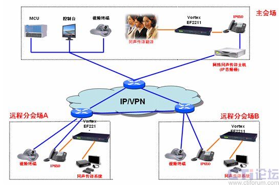 當(dāng)視頻會議召開時,主會場的翻譯既通過同聲傳譯系統(tǒng)把翻譯好的內(nèi)容傳輸?shù)奖镜氐呐c會者,也通過IP音頻會議系統(tǒng)把翻譯好的內(nèi)容傳輸?shù)竭h(yuǎn)端的會場,遠(yuǎn)端會場把音頻系統(tǒng)傳輸過來的聲音經(jīng)過EF2211聲音處理系統(tǒng)處理后傳輸?shù)酵晜髯g系統(tǒng),同聲傳譯系統(tǒng)把聲音經(jīng)無線耳機(jī)傳送給需要的與會者。這樣遠(yuǎn)端會場的與會者既可以聽到主會場的原聲,也可以聽到翻譯好的內(nèi)容。相反,當(dāng)分會場發(fā)言時分會場也可以把本會場的原聲和翻譯好的內(nèi)容傳輸?shù)街鲿䦂。這樣就可以實(shí)現(xiàn)遠(yuǎn)程同聲傳譯。能同時滿足與會的所有人員的翻譯需求,既做到翻譯內(nèi)容的統(tǒng)一,又節(jié)省了翻譯人員的人力成本。