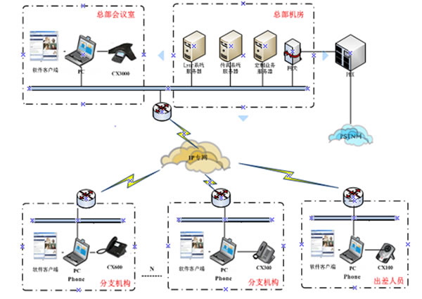 在方案的推進過程中,我們在各大會議室部署了CX3000、在桌面分別部署了CX600與IP331。通過這些終端的自身的優(yōu)勢及與系統(tǒng)的配合,實現了完整的電話體驗、PSTN無縫結合、LYNC完整的企業(yè)級語音功能、 高清晰語音質量 、專業(yè)的語音會議等用戶需求,F在此方案在鳳凰網的會議室及桌面的應用效果良好,場景應用圖如下: