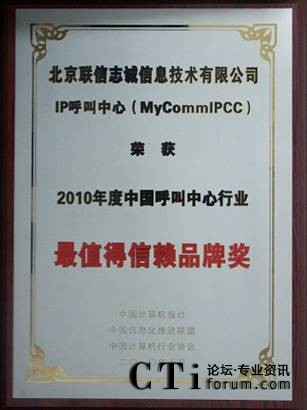 CTI論壇(ctiforum)11月1日消息(記者 潘婷婷):近日,在國(guó)家信息化專家咨詢委員會(huì)的指導(dǎo)下,作為中國(guó)信息化發(fā)展重要推動(dòng)力量的中國(guó)計(jì)算機(jī)報(bào)社、中國(guó)計(jì)算機(jī)行業(yè)協(xié)會(huì)、中國(guó)信息化推進(jìn)聯(lián)盟等國(guó)家級(jí)權(quán)威媒體及國(guó)家信息化領(lǐng)域一級(jí)權(quán)威機(jī)構(gòu),共同組織開展“2010中國(guó)行業(yè)信息化讀者選擇獎(jiǎng)評(píng)選”,重點(diǎn)展示信息化在行業(yè)應(yīng)用中的優(yōu)秀應(yīng)用案例、產(chǎn)品及解決方案。由中國(guó)計(jì)算機(jī)報(bào)社組織業(yè)內(nèi)專家,在經(jīng)過(guò)歷時(shí)3個(gè)月的產(chǎn)品征集、方案論證、專家評(píng)審后,北京聯(lián)信志誠(chéng)信息技術(shù)有限公司(簡(jiǎn)稱MyComm公司),其核心產(chǎn)品MyCommIPCC獨(dú)占2010年中國(guó)呼叫中心行業(yè)最值得信賴品牌獎(jiǎng)。