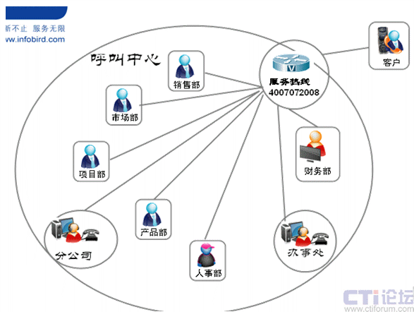訊鳥軟件現(xiàn)有員工150人,總部位于北京,在上海設(shè)有一個分公司,在廣州、深圳分別設(shè)有一個辦事處。通過將呼叫中心與企業(yè)運(yùn)營管理的融合,大大提高了員工的工作效率,降低了運(yùn)營管理成本。訊鳥軟件副總裁姜冬良先生告訴我們,自2007年6月在企業(yè)運(yùn)營管理中加入呼叫中心之后,所有員工對外聯(lián)系的名片上只有公司的400號碼和員工分機(jī),不再顯示員工的手機(jī),這樣有效的避免了因?yàn)閱T工流失造成的客戶服務(wù)無法及時響應(yīng)的現(xiàn)象,同時,所有員工的工作狀態(tài)可以通過報(bào)表系統(tǒng)有效的衡量,尤其是銷售人員和分公司、辦事處人員的工作,管理層可以及時的檢查、監(jiān)督和糾正。