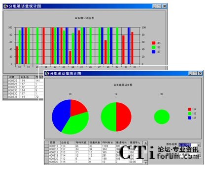 從類別上看,多種業(yè)務,不論種類如何,都可以劃為一類;多個座席可以劃為另一類。因此,同類合在一起,以同樣的圖形表示,就可以作出直觀比較。如二個從事同一業(yè)務的座席的接通率比較就非常有意義
