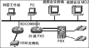 通過(guò)在BDCOM3660路由器上配置相應(yīng)的CE1、語(yǔ)音等功能模塊,中心20個(gè)E1接口可通過(guò)SDH連接17個(gè)地市氣象局和重要的氣象站(共20個(gè)),同時(shí)可供20部電話用以VoIP通話;中心BDCOM3660路由器每臺(tái)配兩個(gè)10/100M以太網(wǎng)端口,使得數(shù)據(jù)和視頻分開,防止網(wǎng)絡(luò)的廣播風(fēng)暴。