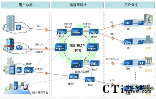 在政府、金融、能源、教育、商業(yè)連鎖等大客戶遠(yuǎn)端機(jī)房,根據(jù)用戶不同類型的業(yè)務(wù)(數(shù)據(jù)、視頻、語音)配置相應(yīng)的轉(zhuǎn)換設(shè)備,如光纖收發(fā)器、V35協(xié)議轉(zhuǎn)換器、以太網(wǎng)協(xié)議轉(zhuǎn)換器、以太網(wǎng)/E1/V35光貓、PDH等,在運(yùn)營商的模塊局/基站等接入機(jī)房部署MSAP機(jī)箱并配置相對應(yīng)的業(yè)務(wù)線卡,將遠(yuǎn)端PDH、FE、V.35、語音等多種接入方式的多路業(yè)務(wù)匯聚后通過STM-1/STM-4等上行口與運(yùn)營商傳輸網(wǎng)SDH/MSTP/PNT對接。在運(yùn)營商中心機(jī)房,可以根據(jù)需要配置機(jī)箱式MSAP,匯聚后通過GE光纖接入用戶中心機(jī)房,也可以直接通過155M/622M/FE/GE光纖接入用戶中心機(jī)房,在用房中心機(jī)房配置MSAP進(jìn)行協(xié)議還原,或直接接入用戶核心路由器的CPOS板卡上。這樣,就完成了整個專網(wǎng)業(yè)務(wù)的接入。