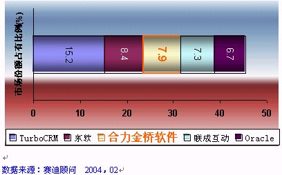 2004年2月10日,北京。賽迪顧問(CCID Consulting )在中國大飯店隆重舉辦了"2004IT市場年會", 會上發(fā)布了《2003-2004年中國管理軟件產業(yè)投資機會研究年度報告》。HOLLYCRM(合力金橋軟件)公司在強手如林的評選中憑借其強勁的市場占有份額、深厚的品牌實力及出眾的用戶美譽度無可爭議地穩(wěn)居2003年度中國CRM軟件整體市場份額前三甲, 同時更奪得了2003年度中國電信行業(yè)CRM市場份額龍頭位置。