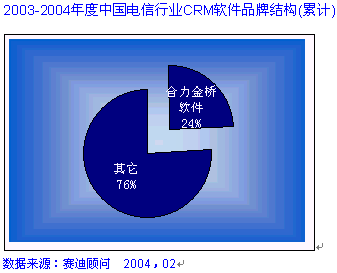 HOLLYCRM(合力金橋軟件)公司作為實力卓越的CRM主流廠商, 致力于提供最專業(yè)化的應用軟件和服務,提供以客戶為核心的信息化解決方案,服務領域跨越電信運營商、金融業(yè)、制造業(yè)等行業(yè)。在電信行業(yè)的CRM市場中,合力金橋軟件處于穩(wěn)固領先位置, 其推出的客戶關系管理解決方案,覆蓋協(xié)作型、運營型和分析型的全部范疇。在CRM產業(yè)在2003年的中國發(fā)展態(tài)勢整體放緩的大環(huán)境下, HOLLYCRM卻一枝獨秀, 在不到一年的時間里簽下中國網通總部、天津網通、山西網通、內蒙聯(lián)通等大型CRM項目,積累了豐富的CRM項目實施經驗。在累計的電信行業(yè)CRM軟件市場中,合力金橋軟件一家占有份額就達到24%, 合力金橋軟件此次在CCID年度研究報告中倍受矚目可謂眾望所歸, 充分說明了其CRM產品在高端行業(yè)的領軍地位, 如圖: